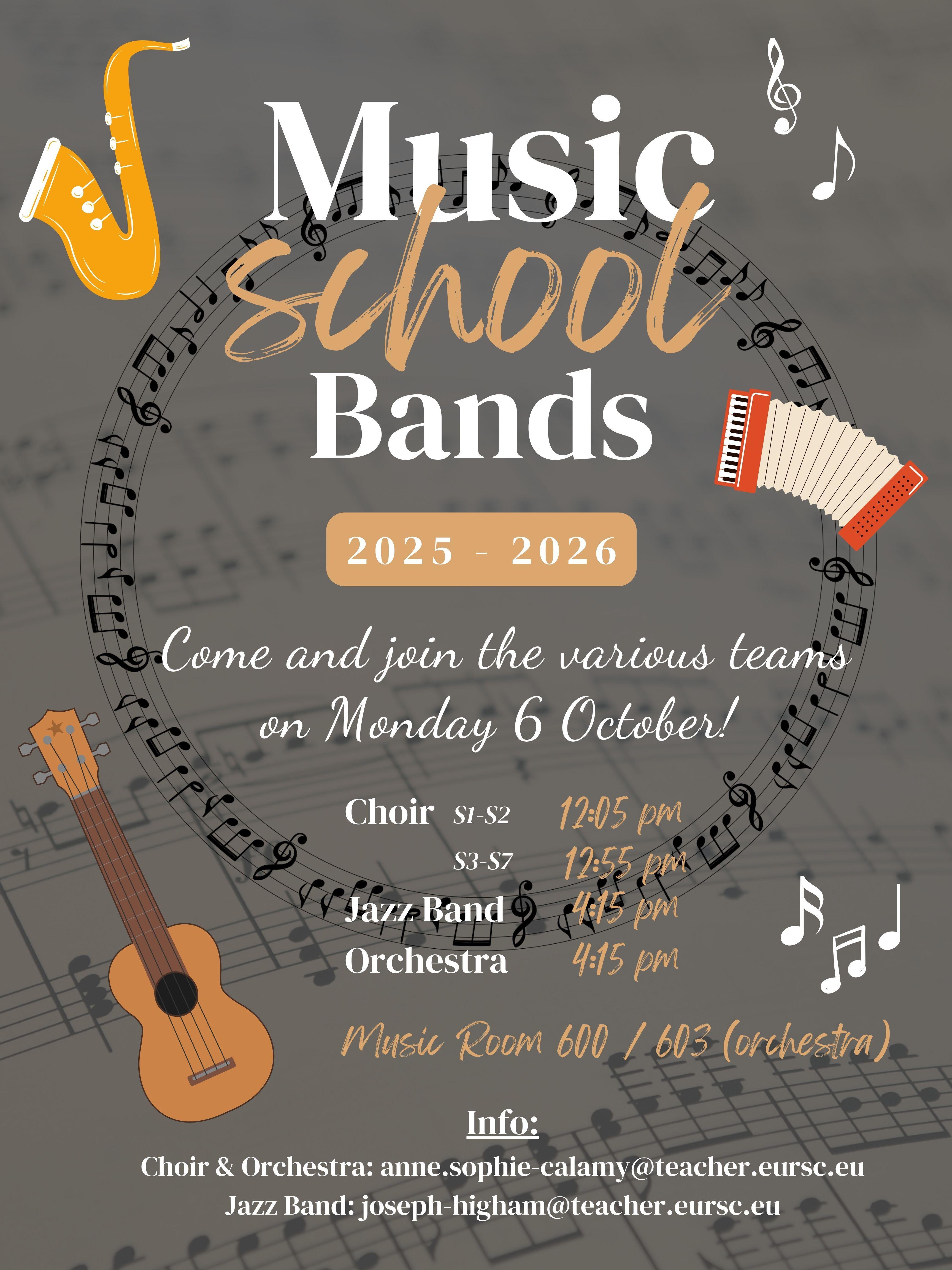 The first meeting on Monday 8 October (16h10 in Music Room 600), is to see who is to see who we have in the band this year, and naturally greet any pupils interested in joining. Unfortunately we cannot except all instruments, so in doubt please contact Mr Higham (highamjo@teacher.eursc.eu). The idea of the band is to try to put together a small repertoire which is a mixture of jazz, pop and rock.